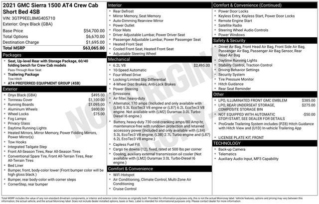 Onyx Black 2021 GMC Sierra 1500 AT4 4WD 10-Speed Automatic EcoTec3 6.2L V8 LOCAL TRADE, 10-Speed Automatic, 4WD, Jet Black With Kalahari Accents Leather, 10-Way Power Driver Seat Adjuster w/Lumbar, 10-Way Power Passenger Seat Adjuster w/Lumbar, 12-Volt Rear Auxiliary Power Outlet, 120-Volt Instrument Panel Power Outlet, 170 Amp Alternator, 2 USB Ports, 2 USB Ports (1st Row), 4-Wheel Disc Brakes, 4.2 Diagonal Color Display Driver Info Center, 4G LTE Wi-Fi Hotspot Capable, 6-Speaker Audio System Feature, Apple CarPlay/Android Auto, AT4 High Clearance Step (LPO), Auto-Locking Rear Differential, Automatic temperature control, Auxiliary External Transmission Oil Cooler, Body-Color Surround Grille, Color-Keyed Carpeting Floor Covering, Compass, Deep-Tinted Glass, Driver Memory, Dual front impact airbags, Dual front side impact airbags, Electric Rear-Window Defogger, Electrical Lock Control Steering Column, Electronic Stability Control, Floor-Mounted Center Console, Front Bucket Seats, Front dual zone A/C, Front Prem Floor Liners w/Removable Carpet Insert, Fully automatic headlights, GMC Connected Access Capable, HD Rear Vision Camera, Heated Driver & Front Outboard Passenger Seating, Heated steering wheel, Heavy-Duty Air Filter, Hill Descent Control, Hitch Guidance, Integrated Trailer Brake Controller, Keyless Open & Start, LED Cargo Area Lighting, Low tire pressure warning, Manual Tilt-Wheel & Telescoping Steering Column, Not Equipped w/Automatic Stop/Start, OnStar & GMC Connected Services Capable, Power Door Locks, Power driver seat, Power Front Passenger Windows w/Express Up/Down, Power Front Windows w/Driver Express Up/Down, Power Rear Windows w/Express Down, Preferred Equipment Group 4SB, ProGrade Trailering System, Radio: Premium GMC Infotainment Sys w/Multi-Touch, Rear Dual USB Charging-Only Ports, Rear Wheelhouse Liners, Red Recovery Hooks, Remote Vehicle Starter System, SiriusXM w/360L, Speed control, Spray-On Pickup Bed Liner w/AT4 Logo, Steering Wheel Audio Controls, Theft Deterrent System (Unauthorized Entry), Traction control, Trailering Package, Tri-Fold Soft Tonneau Cover (LPO), Trip computer, Ventilated Driver & Front Passenger Seats, Wheels: 20 x 9 Machined Aluminum.