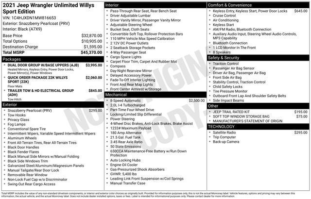 Snazzberry Pearlcoat 2021 Jeep Wrangler Unlimited Willys 4WD 8-Speed Automatic 2.0L I4 DOHC LOCAL TRADE, 240 Amp Alternator, 7 & 4 Pin Wiring Harness, 700 Amp Maintenance Free Battery, Auxiliary Switches, Class II Receiver Hitch, Trailer Tow & HD Electrical Group.