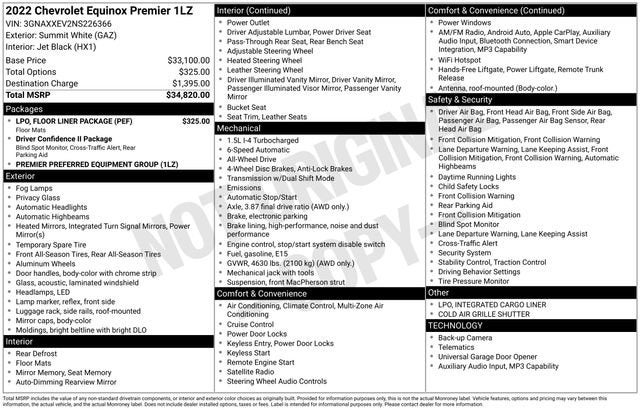 Summit White 2022 Chevrolet Equinox Premier AWD 6-Speed Automatic Electronic with Overdrive 1.5L DOHC AWD, 18 Aluminum Wheels, 2-Way Power Driver Lumbar Control Seat Adjuster, 4-Wheel Disc Brakes, 8-Way Power Driver Seat Adjuster, All-Weather Floor Liners (LPO), Auto High-beam Headlights, Automatic Front & Rear Parking Assist, Automatic temperature control, Bluetooth® For Phone, Brake assist, Dual front impact airbags, Dual front side impact airbags, Electronic Stability Control, Floor Liner Package (LPO), Front dual zone A/C, Fully automatic headlights, Heated Driver & Front Passenger Seats, Heated steering wheel, Integrated Cargo Liner (LPO), Low tire pressure warning, Perforated Leather-Appointed Seat Trim, Power Liftgate, Power windows, Preferred Equipment Group 1LZ, Premium audio system: Chevrolet Infotainment 3 Plus, Rear window wiper, Security system, SiriusXM Radio, Speed control, Traction control, Trip computer, Wireless Apple CarPlay/Wireless Android Auto.